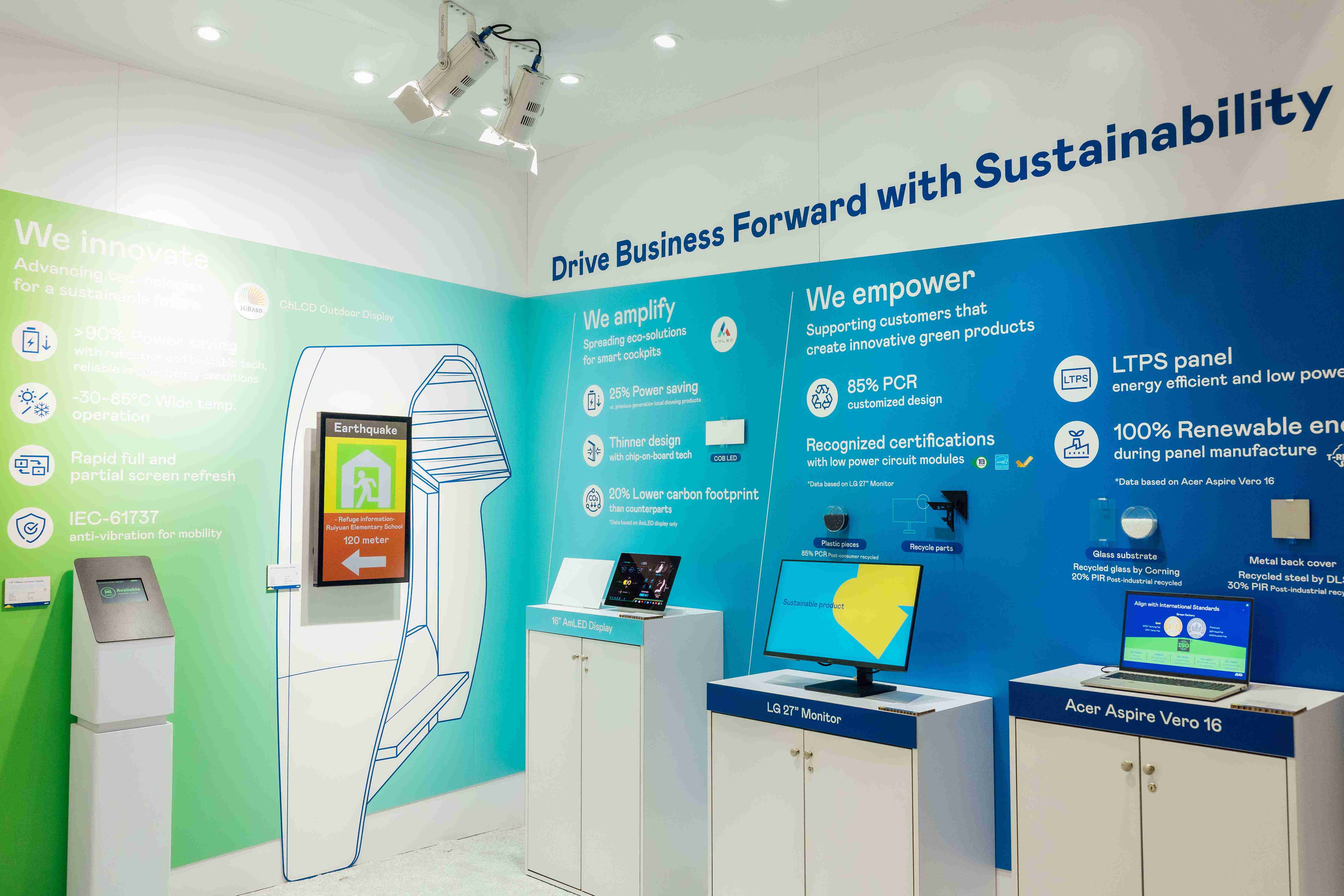PG国际运用创新显示技术HiRaso胆固醇液晶双稳态技术达到显示零耗能、、扩大节能省电的AmLED显示技术应用于车用产品、、、以再生的消费后回收(PCR)塑料及全绿电生产之面板,,应用于笔电及萤幕,,,,增加绿色价值。。。。